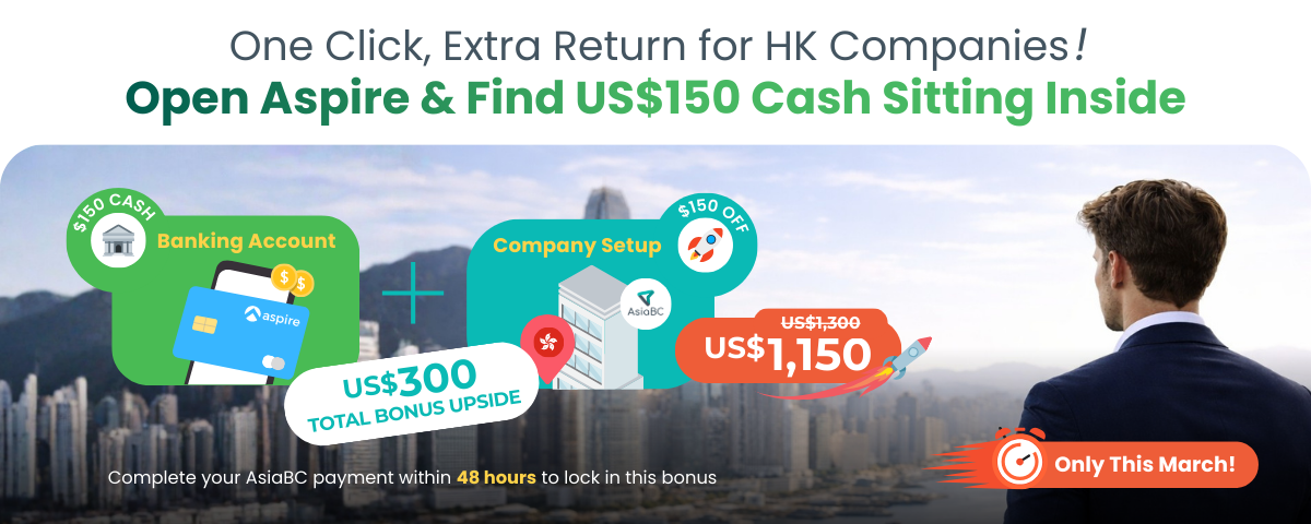 Earn US$300 Bonus NOW | AsiaBC x Aspire Start-Up Offer Earn US$300 Bonus Now – Setting Up HK Company with Aspire Business Account "*" indicates required fields Almost there! Upload 2 files now to lock in your US$300 upside – March only. Full Name* Contact Email* Proposed Company Name* Business Nature* Are You a Shareholder? Yes No Passport Copy*Max. file size: 6 MB.Residential Address Proof*Max. file size: 6 MB.(Sample Here)Selfie with Your Face & PassportMax. file size: 6 MB.(Sample Here)Supplementary Information Terms and Conditions Offer valid for new HK Company Formation Package clients who sign up between 1–31 March 2026 and settle the full package fee within 48 hours of invoice. Aspire account opening is subject to Aspire’s own approval criteria and a minimum top-up of HK$5,000. The US$150 cash reward is credited by Aspire to the client’s Aspire account after internal verification by Aspire’s finance team. AsiaBC will submit eligible cases after campaign end; Aspire will normally complete checks during April 2026, and, if there are no issues, cash rewards are expected to be credited by the second week of May 2026 (timeline indicative only). The US$150 setup discount is applied by AsiaBC at the time of invoicing (HK Company Formation Package: now US$1,150, originally US$1,300). This promotion cannot be used together with other AsiaBC discounts unless explicitly stated. AsiaBC and Aspire reserve the right of final decision and may amend the offer or terms without prior notice. HiddenGCLID CAPTCHAPhoneThis field is for validation purposes and should be left unchanged.