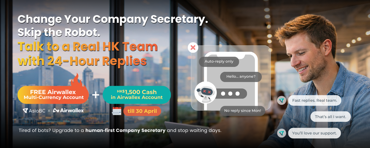 Pocket HK$1,500 & Real Human Replies. Switch Your Company Secretary Now | AsiaBC x Airwallex Switch Your Company Secretary. Pocket HK$1,500 & Real Human Replies. "*" indicates required fields Almost there! Upload 2 files now to lock in your HK$1,500 bonus till 30 April. Full Name* Contact Email* Contact NumberCompany Name* Business Nature* BR Copy*Max. file size: 6 MB.Business Registration Certificate from HKCR Documents Copy*Max. file size: 6 MB.(e.g. NNC1, CI)Annual Return DocumentsMax. file size: 6 MB.(e.g. NAR1) Terms and Conditions This offer is valid for new Change of Company Secretary clients who sign up with AsiaBC between 20 March 2026 and 30 April 2026 and successfully complete the Change of Company Secretary to AsiaBC under this campaign. To be eligible, the client must not already have an existing Airwallex account at the time of sign‑up under this promotion, and the client’s Airwallex application must be submitted by AsiaBC via the designated sign‑up portal. Airwallex account opening is subject to Airwallex’s own internal approval criteria and onboarding procedures. AsiaBC has no control over, and does not guarantee, the outcome or timing of Airwallex’s approval process. Under this promotion, eligible clients must create an Airwallex card and complete a minimum cumulative card spend of US$500 (or equivalent in other currencies) on or before 15 May 2026. For clients who meet all of the above requirements (including successful Change of Company Secretary to AsiaBC, Airwallex account approval and the minimum US$500 card spend by 15 May 2026), HK$1,500 will be credited by Airwallex to the client’s new Airwallex account on or before 31 July 2026. The rebate timeline is indicative only and may be subject to Airwallex’s internal processing schedule. The HK$1,500 rebate is provided and fulfilled by Airwallex, not by AsiaBC. AsiaBC is not responsible for any delay, dispute, or non‑fulfilment relating to the rebate. This promotion is limited to one rebate per eligible company and cannot be transferred, exchanged for cash, or used together with other AsiaBC or Airwallex promotional offers unless explicitly stated. In case of any suspected abuse, fraud, or breach of these Terms and Conditions, AsiaBC and Airwallex reserve the right to disqualify the client from the promotion and/or cancel the rebate without prior notice. AsiaBC and Airwallex reserve the right of final decision in relation to eligibility, interpretation of these Terms and Conditions, and all other matters relating to this promotion. They also reserve the right to amend, suspend, or terminate the promotion or its terms at any time without prior notice. HiddenGCLID CAPTCHACommentsThis field is for validation purposes and should be left unchanged.